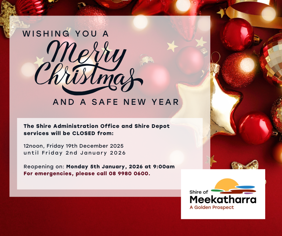 Please see the Christmas closure dates for the Shire Administration, Depot and Youth Services below.