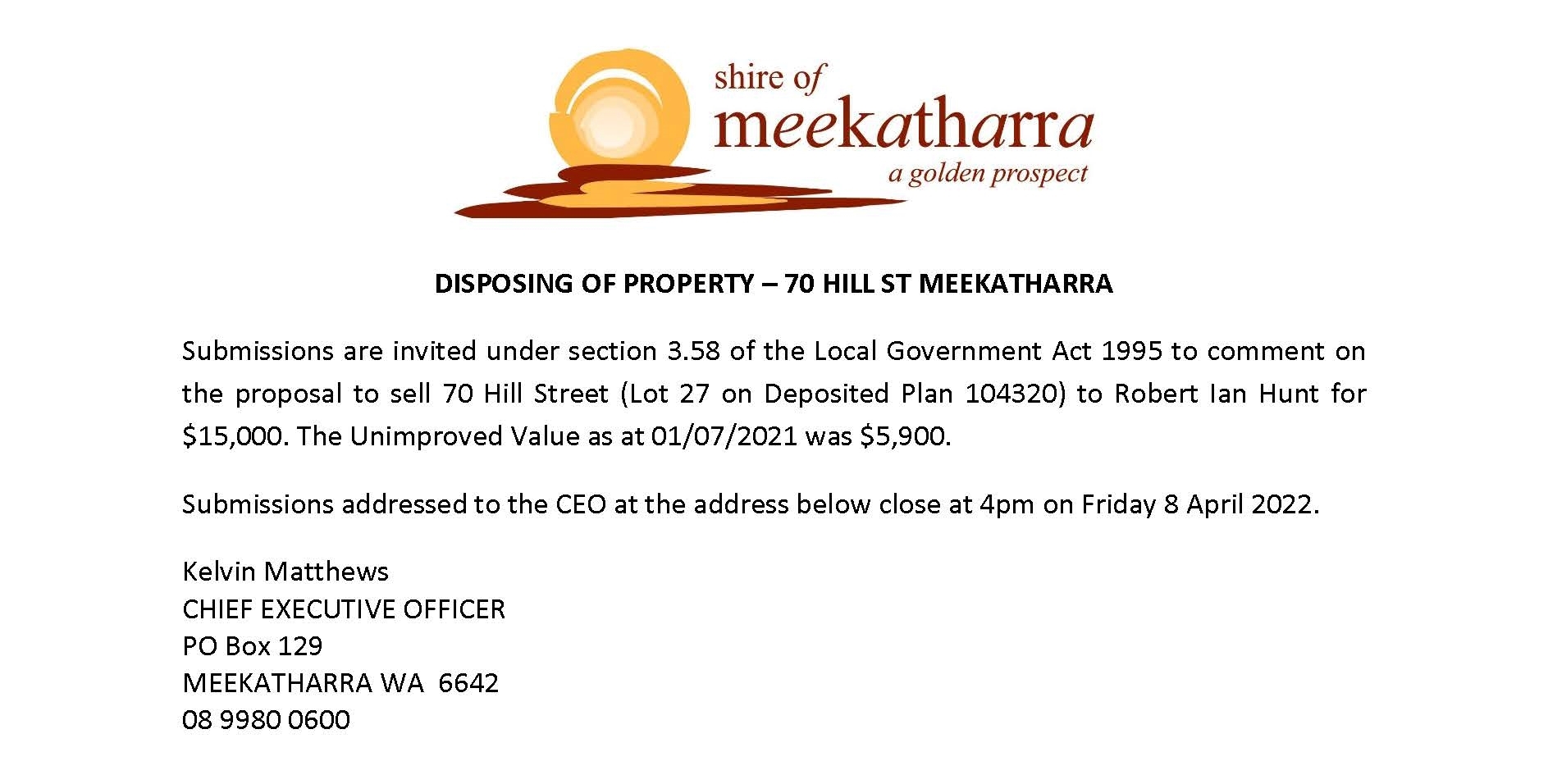 Submissions are invited under section 3.58 of the Local Government Act 1995 to comment on the proposal to sell 70 Hill Street (Lot 27 on Deposited Plan 104320) to Robert Ian Hunt for $15,000. The Unimproved Value as at 01/07/2021 was $5,900.